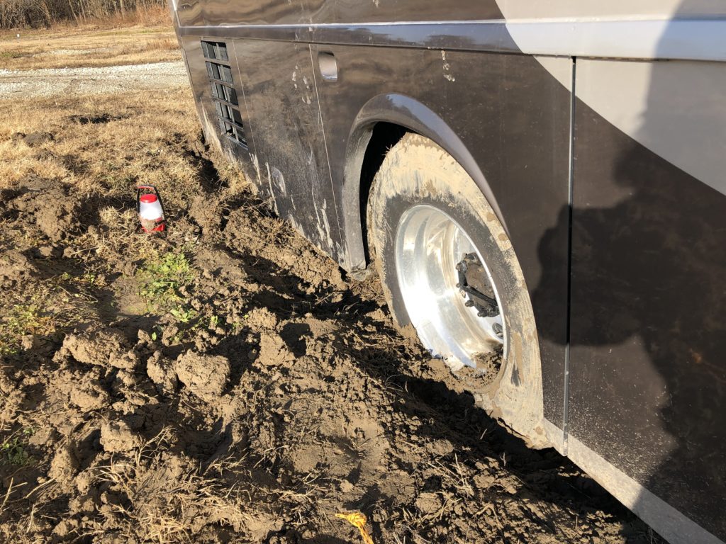 It was early Sunday morning, the day we were set to leave. The gravel road looped around the park, and the way we were parked in our pull-through spot pointed us in the direction of the shorter but steeper way out. To get the rig pointed in the longer but more level path, we took Rexy across a field where two points of the road were closest together. Unfortunately for us, we underestimated the softness of the ground after the previous days’ rains. Rexy’s back tire sank a foot into the mud.