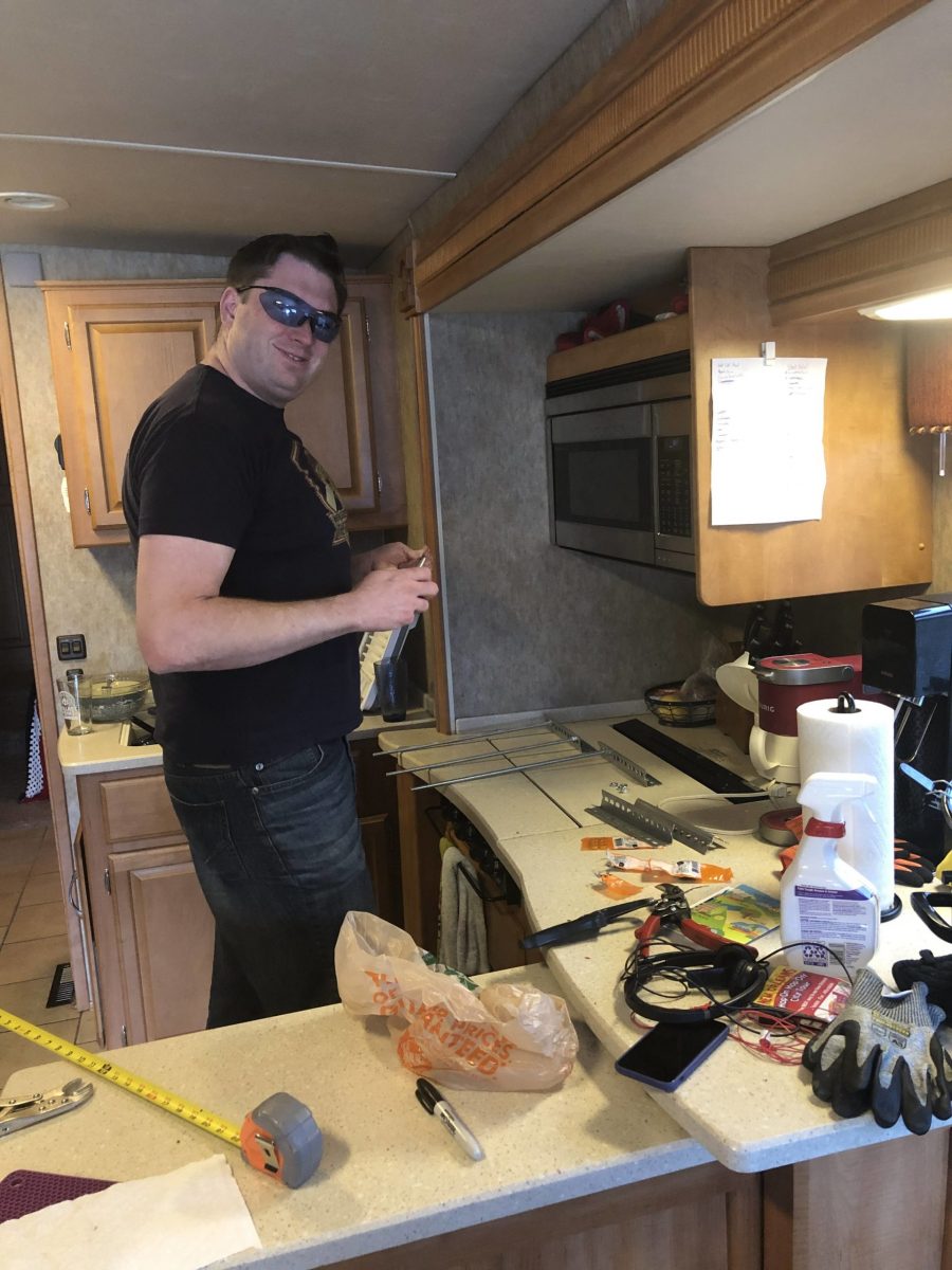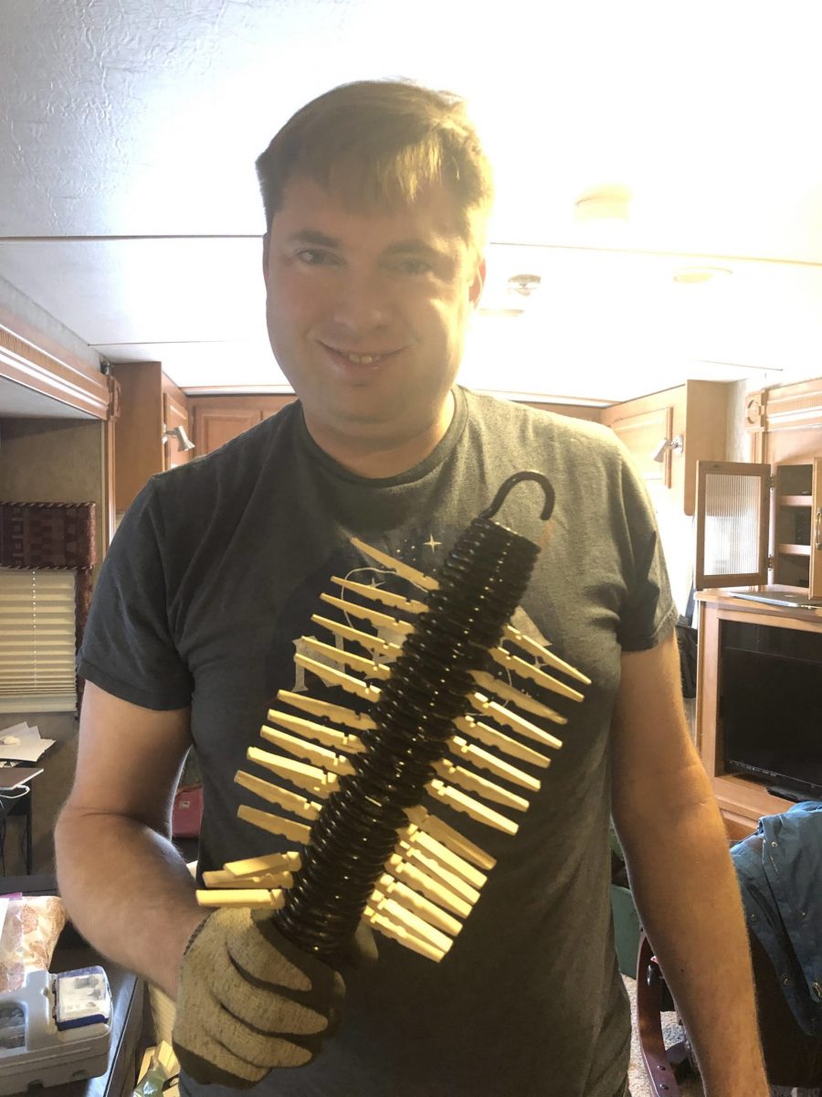 These suckers are difficult to extend by hand, so for our first attempt we fashioned our own jig out of threaded rods and slotted angles. (Have you ever Dremeled solid zinc in your bathroom? The noise is almost as amazing as the smell.) This worked to expand the coil, but the jig wouldn’t fit in the narrow space where the spring hooked into the chassis. Second attempt: use the jig to expand the spring and insert clothespin halves into the gaps as shims. This did the trick, and we got both springs installed on the rear driver-side jack. Between our trial and error plus installation, the repair took most of our daylight. Since the rear passenger-side jack still has one working spring, we’ll wait until Florida to replace the pair at once.